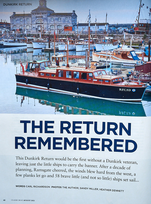 August 2025 issue of Classic Boat: Main photo and 2nd photo for feature on the Dunkirk Return