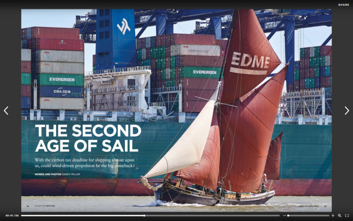 July 2023 issue of Classic Boat: Text and main images for 6 page feature on the sail cargo movement