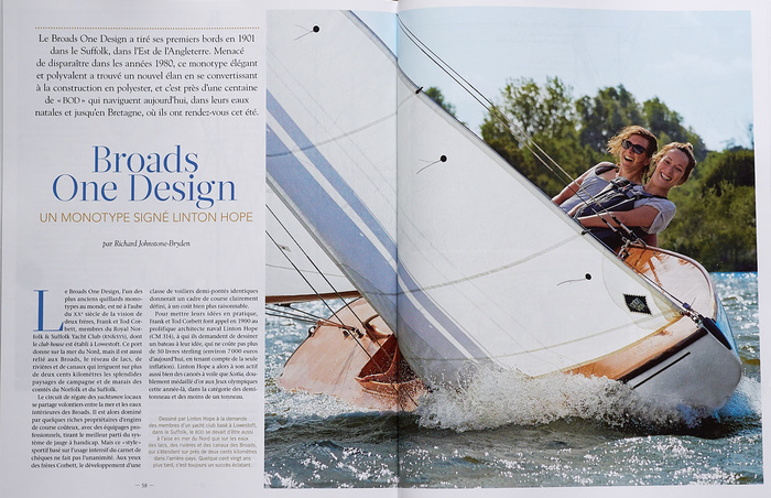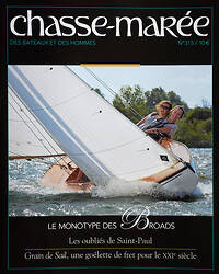 August 2020 issue of Le Chasse Marée: Cover photo and main photo for inside feature on Broads One Designs.